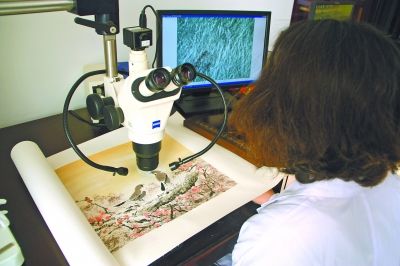 中国艺术科技研究所艺术品科研中心,科研人员在观察显微镜下的画作。通过显微镜,可以看清画纸上的微观纤维状态,这是独一无二无法伪造的。CFP供图