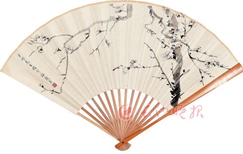 此扇正面是杨小楼以隶书节录的王粲诗《从军诗》:“从军有苦乐,但问所从谁。所从神且武,焉得久劳师。相公征关右,赫怒震天威。举灭獯虏,再举服羌夷。”杨小楼的书法笔墨沉实,线条遒劲,结体紧密,端庄规整,承汉隶正脉;反面是梅兰芳的绘画,以淡墨寥寥数笔写就一株旁逸斜出的白梅,两作端庄与婀娜相映,无形中体现了两人所扮演的舞台角色,正所谓:“画者,心迹也!”