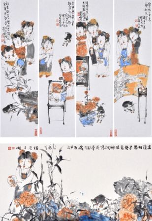 书画讲究寄情,文人画仕女画是最能反映文人骚客的心境的。“一花一世界,一草一天堂,非亲临其境,道不得此语”、“诗家清景在新春,绿柳才黄半未匀”……他笔下那些青春年少的簪花女子,总是娴静地或坐或立,瑞鹤孑孑蝴蝶翩翩。从人物的形态和表情来说,于明汲取了唐风遗韵,却又和以往的唐仕女感觉明显不同。因为,于明虽然讷言并不含蓄,他在快乐地作画,“画画是一件幸福的事儿,我也是花了五年的时间,才找到这种幸福感,尤其画仕女的时候,特别轻松,自由。”于明如是说。